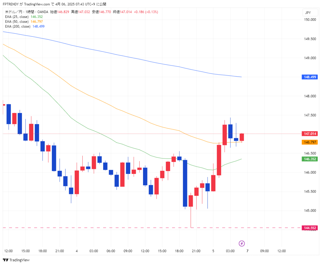 ドル円(1時間足、2025年4月6日07:43時点)。一時144.552円まで下落し、関税ショックによる急激な円高を示した。その後、EMA(50)を上抜け、短期的な反発を示唆しているが、EMA(200)の148.499付近が上値抵抗となる可能性も。出典:FPTRENDY.com(TradingView)
