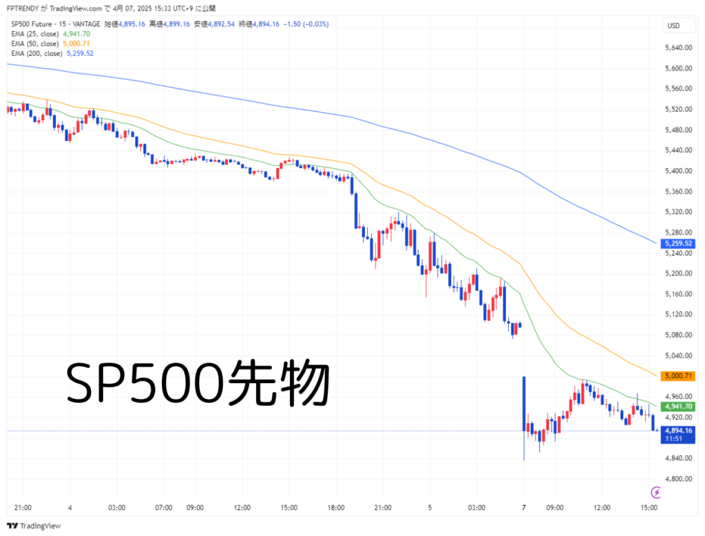 📉 S&P500先物(15分足、2025年4月7日15:33時点)