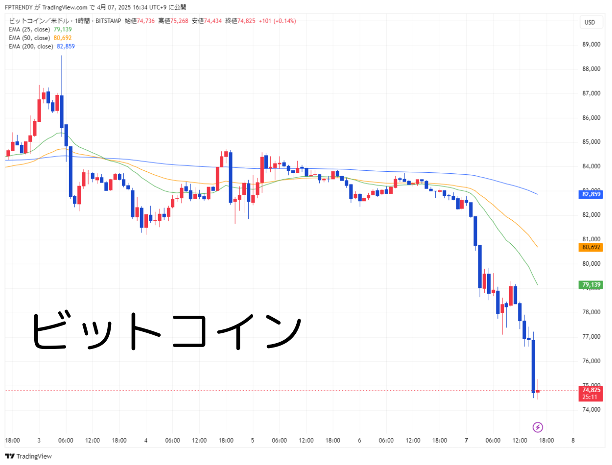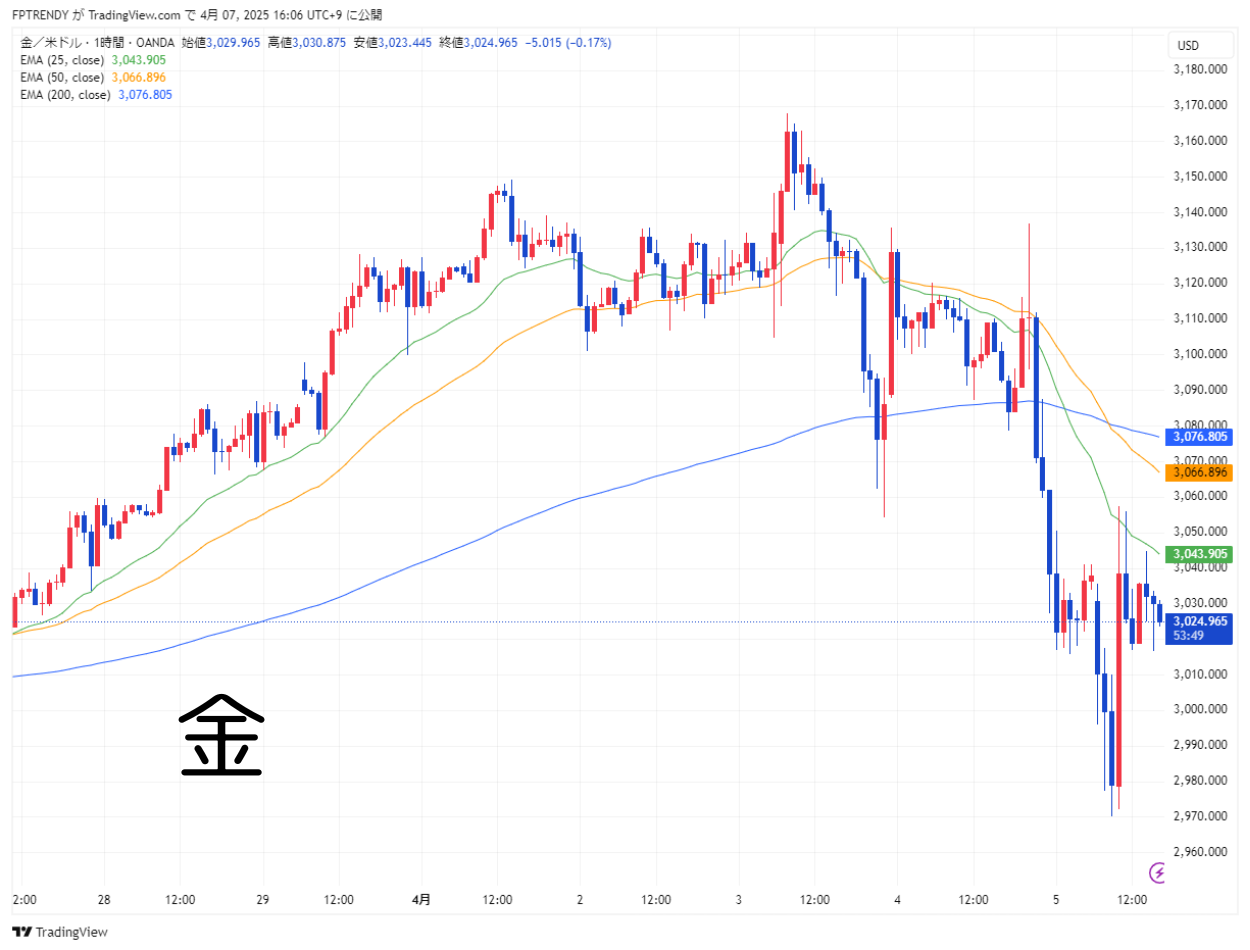 一方、安全資産とされる金は一時3,170ドル台の過去最高値を更新しましたが、その後は関税ショックの影響で利益確定売りが入り、3,000ドル台前半まで急落。