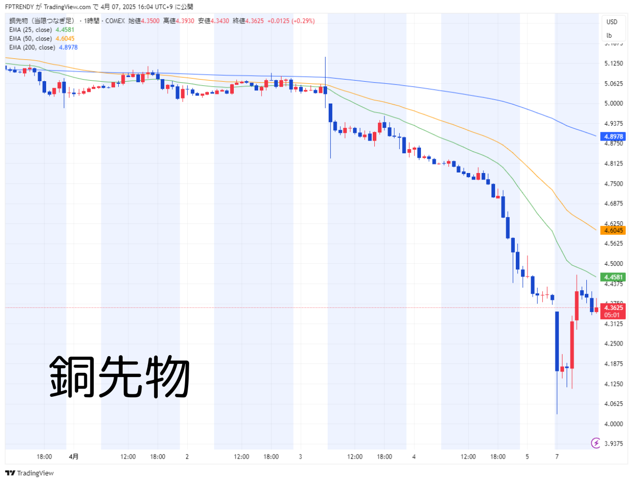📉 銅先物(1時間足、2025年4月7日時点)