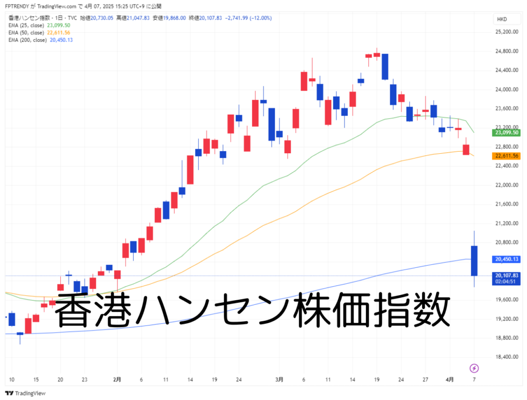 アジア市場では、香港ハンセン指数が2025年4月7日時点で前日比▲12.00%の急落。日本では日経平均が1週間で約9%下落し、サーキットブレーカーも発動されました。東南アジア諸国では、シンガポールや台湾などの市場でも5~10%の大幅下落が見られ、地域全体が“関税ショック”に巻き込まれています。
