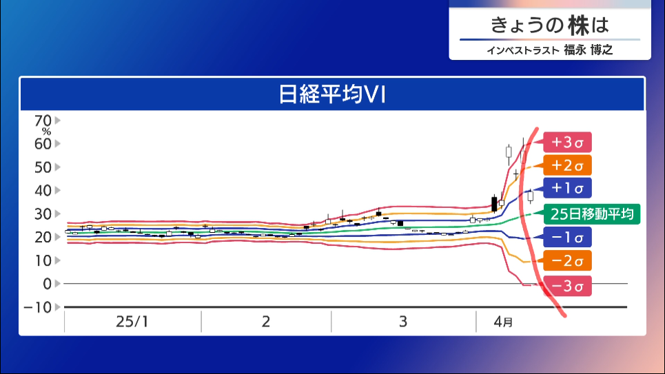 📌 モーサテで紹介された日経平均VIのタームストラクチャーチャート(2025年4月10日放送より)。過去25年の平均を大きく超える“+3σ”水準の急騰が示された。