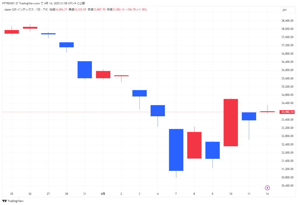 「関税ショックからの急落後、上昇・下落を繰り返しつつ持ち直しの動き。米国株の堅調やリスク後退が追い風となり、再び34,000円台をうかがう展開。」