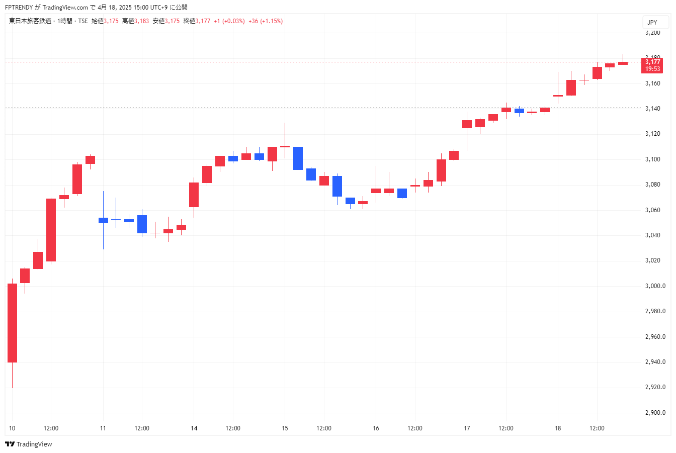 JR東日本も堅調です。2025年4月18日終値は3,177円(+1.15%)としっかりとした動き。