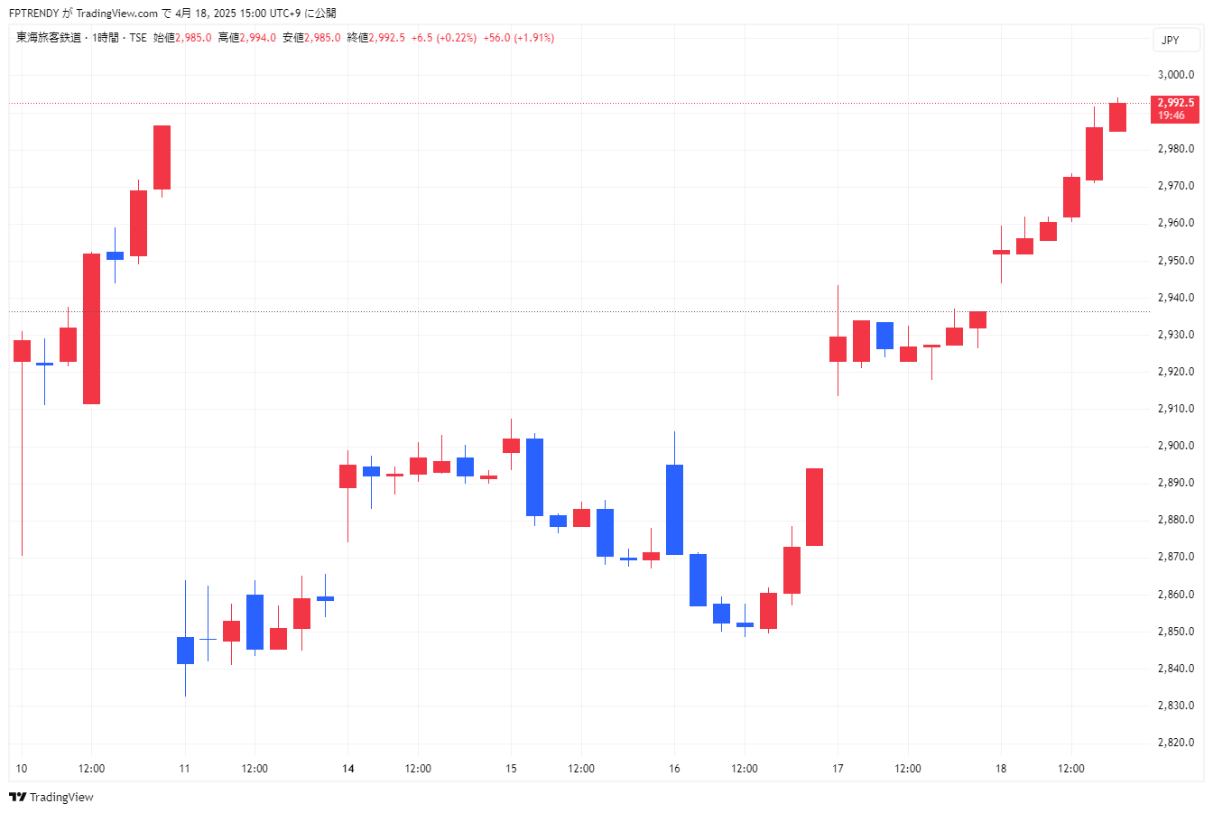 東海道新幹線を軸に事業展開するJR東海は、2025年4月18日終値が2,992.5円と反発基調が継続。