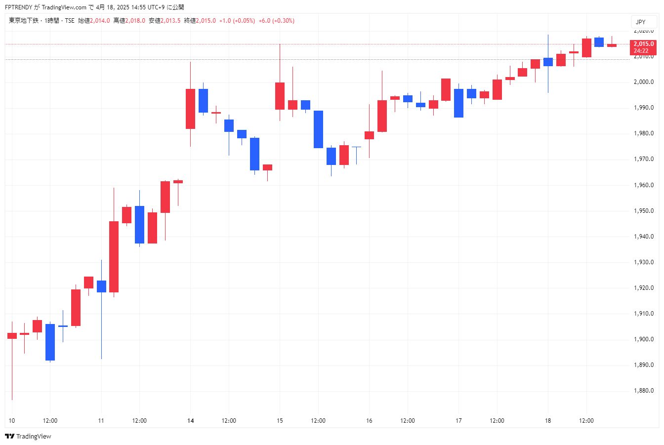 2025年4月18日、東京メトロは一時2,018.5円まで上昇し、15日に記録した上場来高値(2,015円)を更新しました。