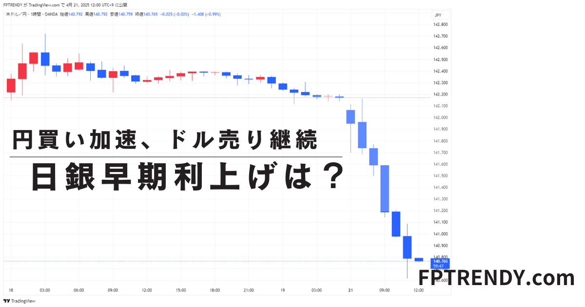2025年4月21日午前の東京外国為替市場では、1ドル=140.77円まで円高が進行し、昨年9月中旬以来の7カ月ぶり高値を更新した。この円高の一因として、市場では依然として「日銀の早期利上げ論」が燻っており、さらに日米間で始まった通商協議における為替条項への警戒感も根強い。