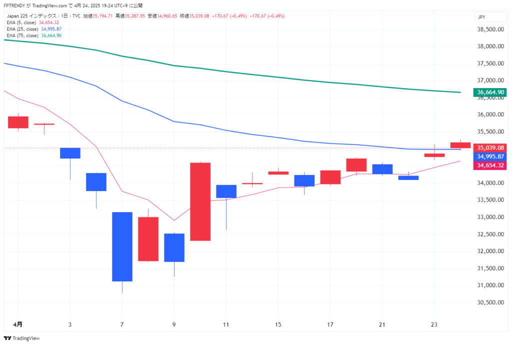 日経225は赤の5日線を上抜け、短期的な反発ムードが強まっている。