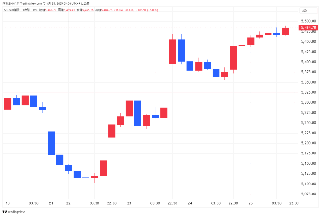22日の安値5,100台から23日に急反発し、24日には一時5,500手前まで上昇。直近は5,480台で高値圏を維持しており、強い買い戻し基調が続いています。