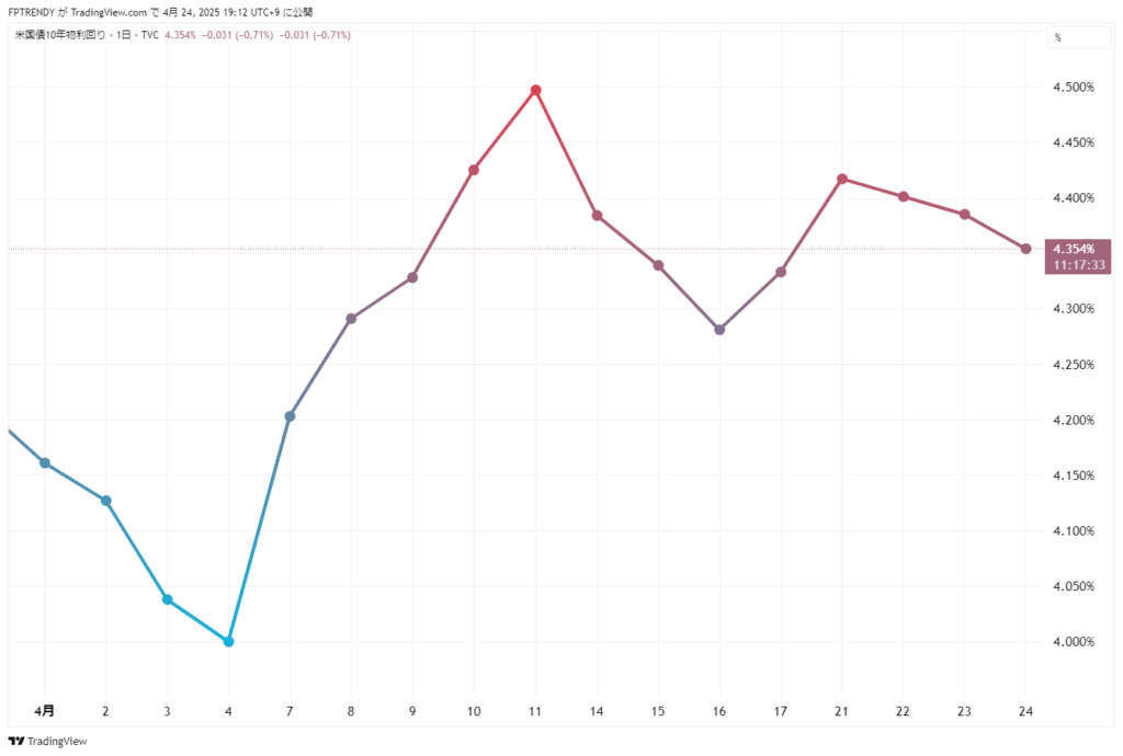先週11日の高値4.50%台から調整し、4.35%付近で落ち着く展開。長期金利は高止まりながらも利食い売りが優勢となり、一服感が出ています。