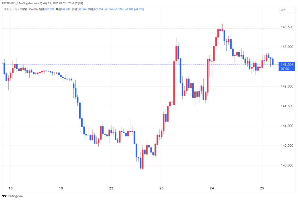 22日に約140円を割り込む安値を付けた後、23日に大きく反発して一時143.50円台まで上昇。その後は142.50円付近で膠着し、米経済指標やFOMC前の様子見ムードが強い展開です。