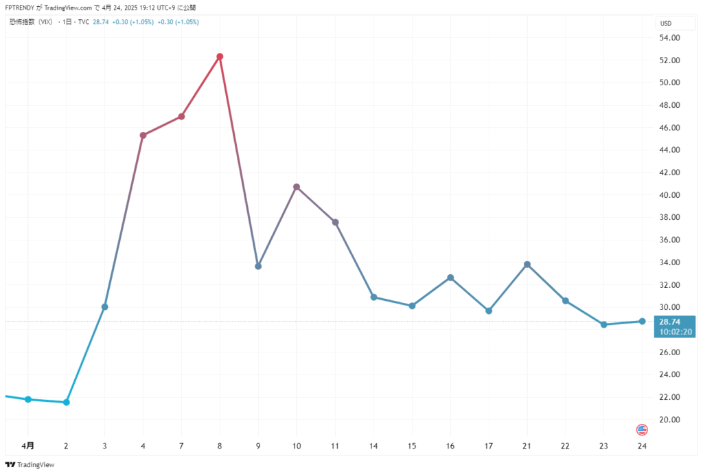 恐怖指数は3月末~4月上旬にかけ急騰後、徐々に低下。24日は28.74と小幅反発したものの、依然として20台後半の水準で高止まりしており、市場の警戒感は依然残ります。