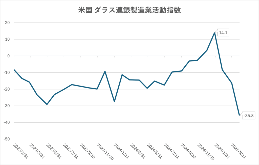 2025年4月28日に発表された米ダラス連邦準備銀行(ダラス連銀)の製造業景況感指数は、-35.8と市場予想を大きく下回り、2020年5月以来の低水準を記録しました。前月(3月)は-16.3だったため、景況感の悪化は急速に進んでいます。