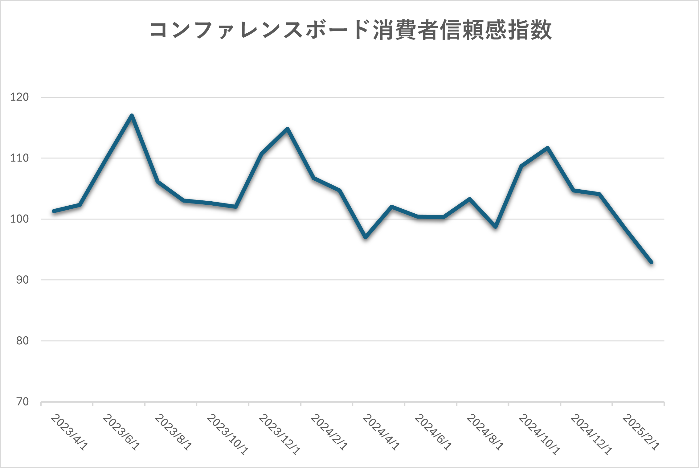 2024年11月の111.7をピークに5カ月連続で低下が続いており、2025年に入ってからは特に急速な悪化が目立つ。この間に指数は25.7ポイント低下しており、消費者心理の急激な冷え込みが懸念される。