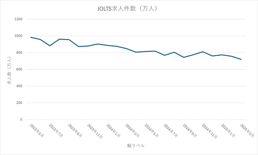 - アメリカ労働省が発表した2025年3月のJOLTS求人件数は、719.2万人となり、市場予想(752.0万人)を下回った。