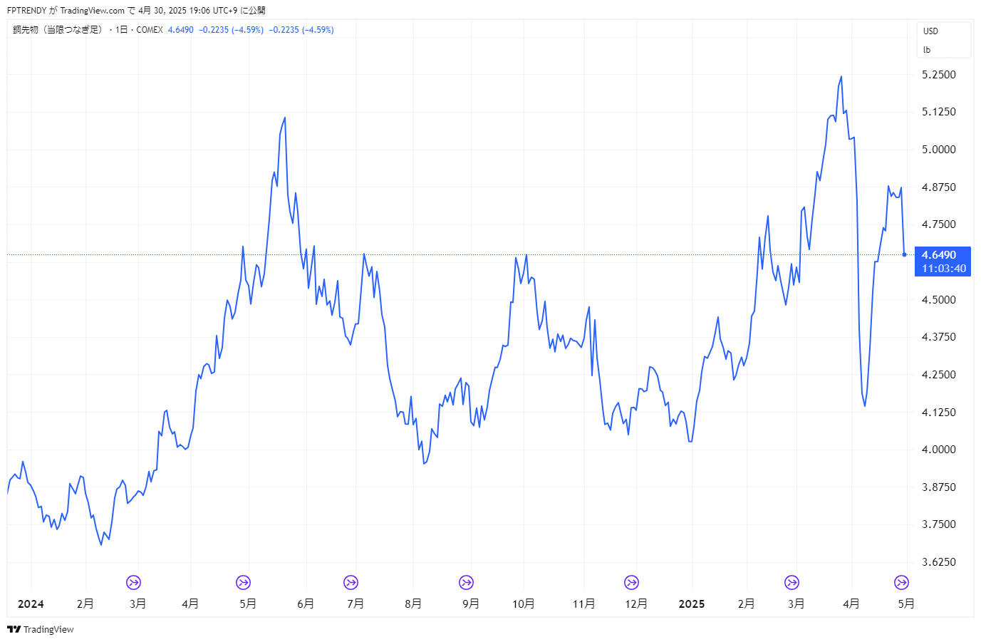 出典:TradingView「HG1!(COMEX銅先物)」|2024年〜2025年の推移