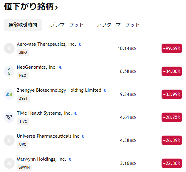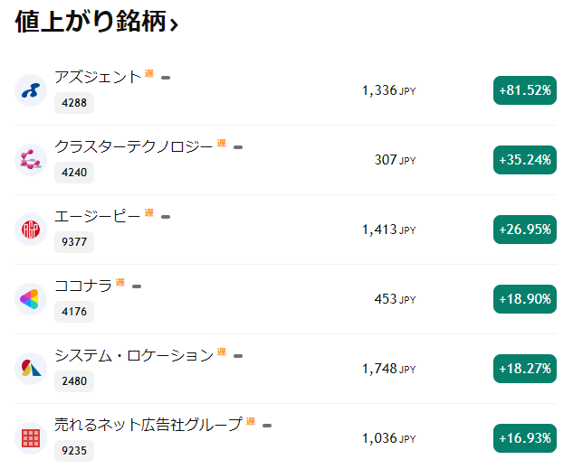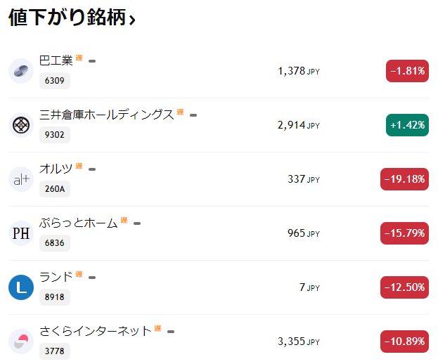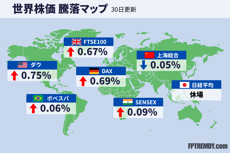 [Updated on the morning of April 30] Ranking of growth and decline rates|Quick check of trends and indicators of Japanese and U.S. stocks 2025 4/30 未分類 2025-04-30 table of contents 国別主要株価指数 騰落率ランキング あわせて読みたい 🌐主要株価指数(世界)【リアルタイム更新】 日米欧中を中心とした世界の代表的な株価指数を一覧表示。最新の騰落や各国の市場動向をリアルタイムで確認できます。 個別株騰落率ランキング 日本株|値上がり銘柄ランキング 日本株|値下がり銘柄ランキング 米国株|値上がり銘柄ランキング 米国株|値下がり銘柄ランキング あわせて読みたい U.S. Stock Heatmap 米国株市場のセクター別ヒートマップをリアルタイム表示。注目銘柄の上昇・下落を視覚的に確認できる便利なツールです。 対米ドル通貨強弱ランキング ※米ドルインデックスは参考値 あわせて読みたい 💱クロス通貨ヒートマップ 主要通貨の相対的な強さが一目でわかるクロス通貨ヒートマップ。為替相場の全体像を直感的に把握し、通貨の強弱を視覚的に確認できます。 📈 仮想通貨|24時間騰落率ランキング(4月30日早朝) あわせて読みたい 主要仮想通貨リアルタイム価格一覧|ビットコイン・イーサリアムなど主要銘柄をサクッとチェック! 仮想通貨の主要銘柄(BTC, ETH, XRP, SOL, ADA, BNB, DOGE)リアルタイムランキング!現在の価格と騰落率をサクッとチェック。 あわせて読みたい 仮想通貨リアルタイムランキングページ(全銘柄) 仮想通貨のリアルタイム騰落率ランキング!ビットコイン・イーサリアムを含む約324銘柄の1日〜年間変動率を一覧表示。主要通貨も草コインもカバー。 関連 未分類 Market Summary Small-cap stocks Investment Information Japan Stocks Stock U.S. Stocks Rate of change ranking Please share it if you like! URL copied! URL copied! Morning News for Wednesday, April 30 U.S.A. JOLTS Job Openings 03/04/29 23:00 Person who wrote this article SHUICHI TANIOKA CFP®/Level 1 Financial Planning Technician Certified by the Japan Securities Analysts Association ・Primary Private Banker ・Asset Formation Consultant Certified by the Financial and Financial Situation Study Group ・NISA Trading Advisor Related Posts 人生の転機は保険の転機(転職・退職は見直しのチャンス) 2025-08-28 株 vs 金 vs 仮想通貨 ― 複利の源泉はどこか 2025-08-18 FANG+とは?注目される理由 2025-08-18 金投資をETFで持つならどこに投資すべきか? 2025-08-18 半導体業界の「体温計」SOX指数──アプライド決算が示すリスクと現状 2025-08-18 NVIDIA vs インテル ― 政府支援の意味 2025-08-17 米政府のインテル出資協議と株価急騰──時系列で読み解く市場の反応 2025-08-17 来週の経済指標カレンダー+注目ポイント(2025年8月18日〜22日) 2025-08-17