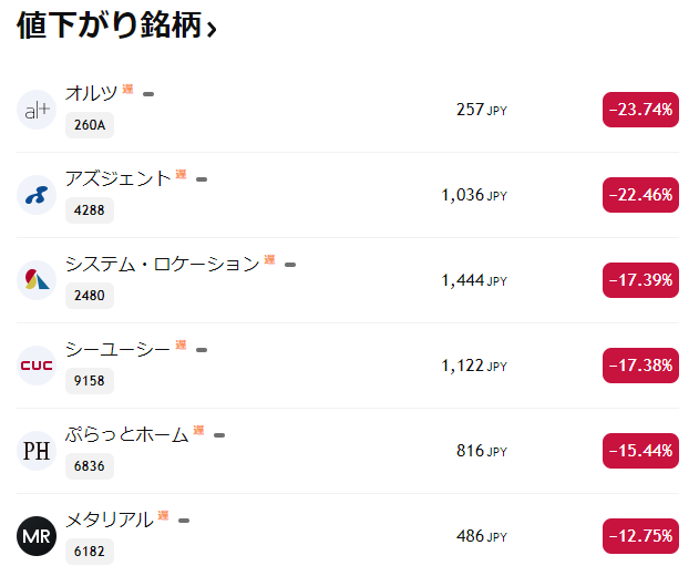 下落率トップとなったのは、AIスタートアップとして知られる**オルツ(260A)で−23.74%の急落。直近の材料出尽くし感や需給悪化が要因とみられます。2位のアズジェント(4288)**は、情報セキュリティ関連銘柄ながら、今期業績予想の慎重な見通しが嫌気されました。