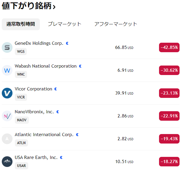 米国株|値下がり銘柄ランキング