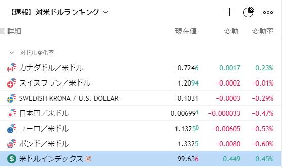 その他、**スイスフラン(CHF/USD)and スウェーデンクローナ(SEK/USD)**も小幅ながらドルに対して下落し、全体としてドル独歩高の様相となりました。
