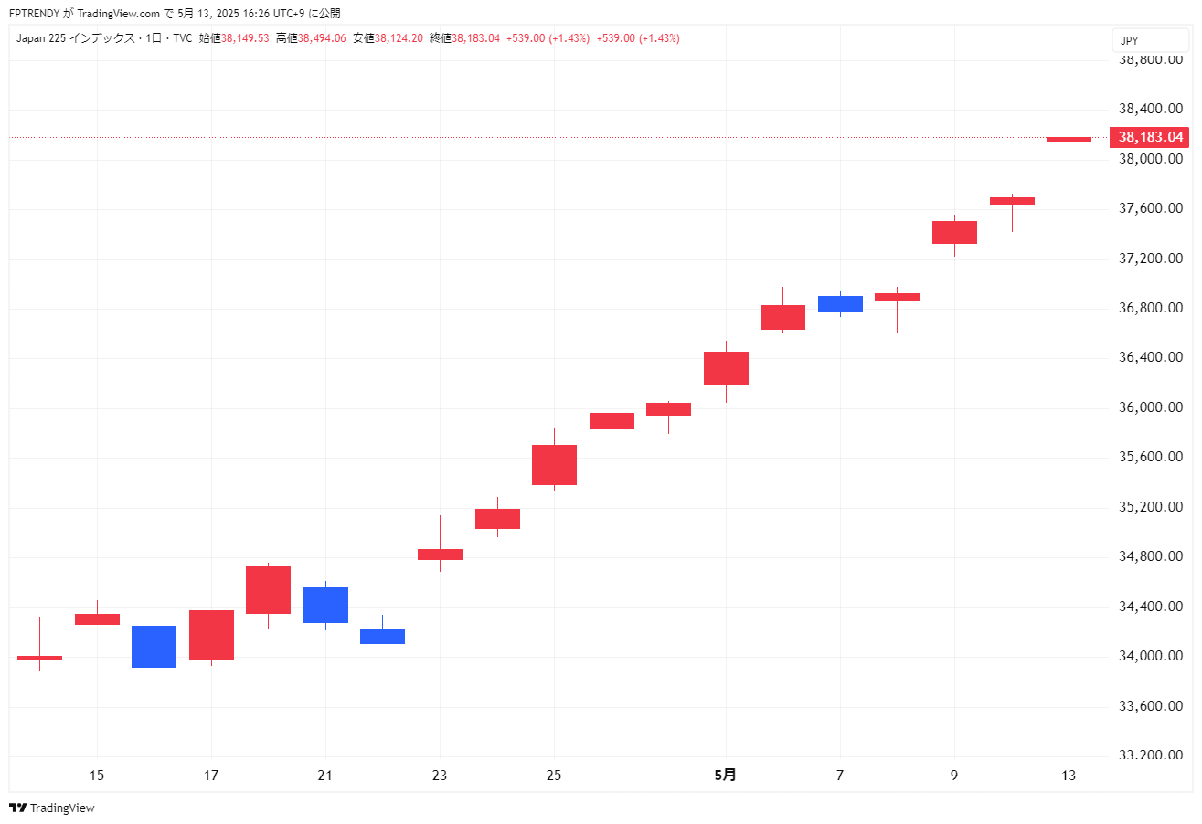 米中が12日に発表した追加関税の引き下げ合意を受けて、13日の東京市場は買い優勢でスタート。日経平均株価は前日比+539円(+1.43%)の38,183円04銭で取引を終え、2月27日以来の高値を更新しました。