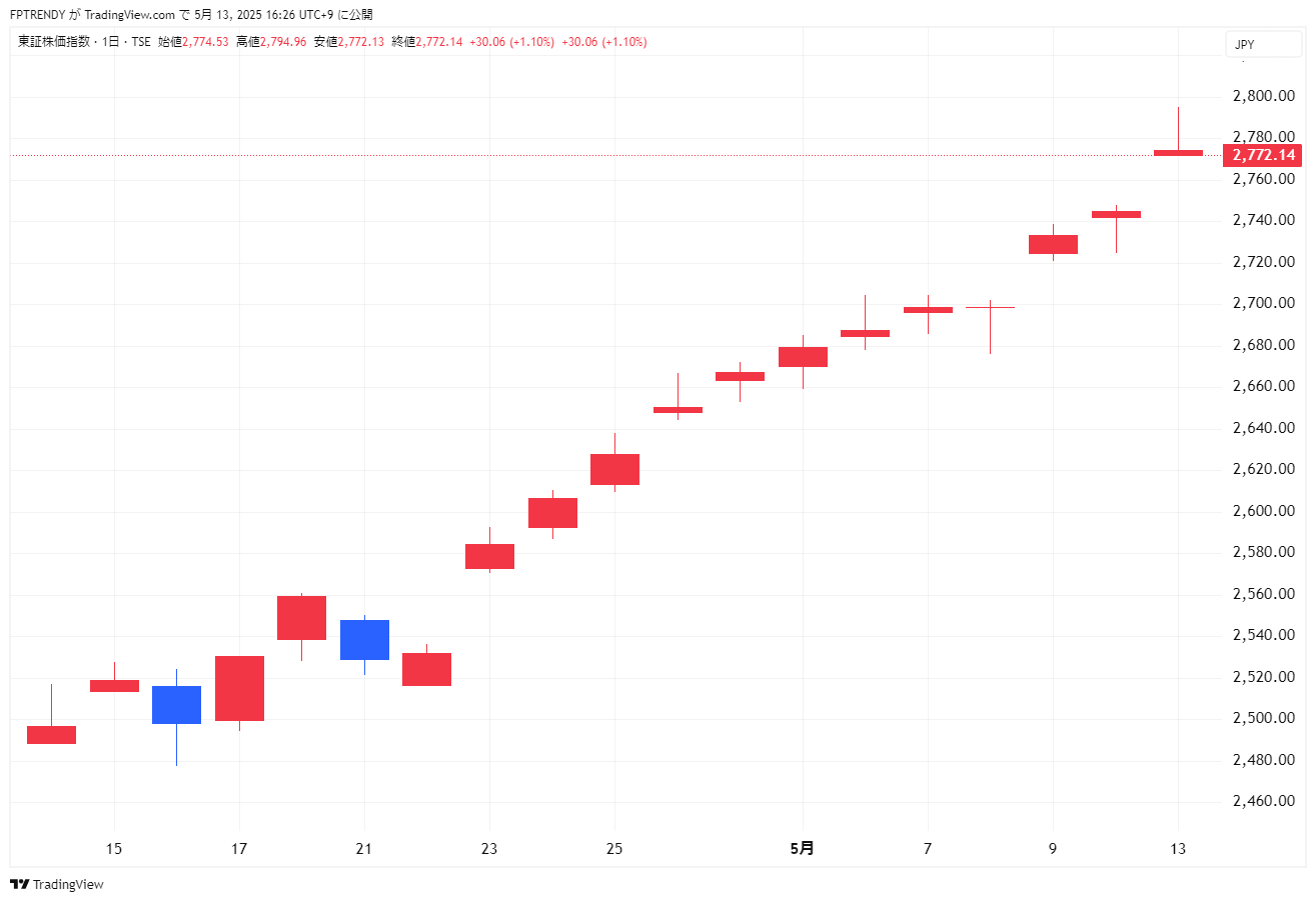 TOPIX(東証株価指数)も前日比+30.06pt(+1.10%)の2,772.14で13日続伸。13連騰は2009年8月以来、実に約15年ぶりという記録的な動きとなりました。