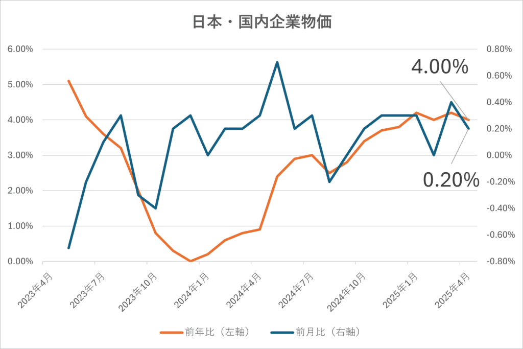 日本銀行が発表した2025年4月の国内企業物価指数は、指数水準が126.3(2020年平均=100)となり、8か月連続で過去最高を更新しました。前年同月比は**+4.0%(予想:4.0%)と市場予想に一致し、前月比は+0.2%**(予想:+0.4%、前回:+0.4%)となりました。