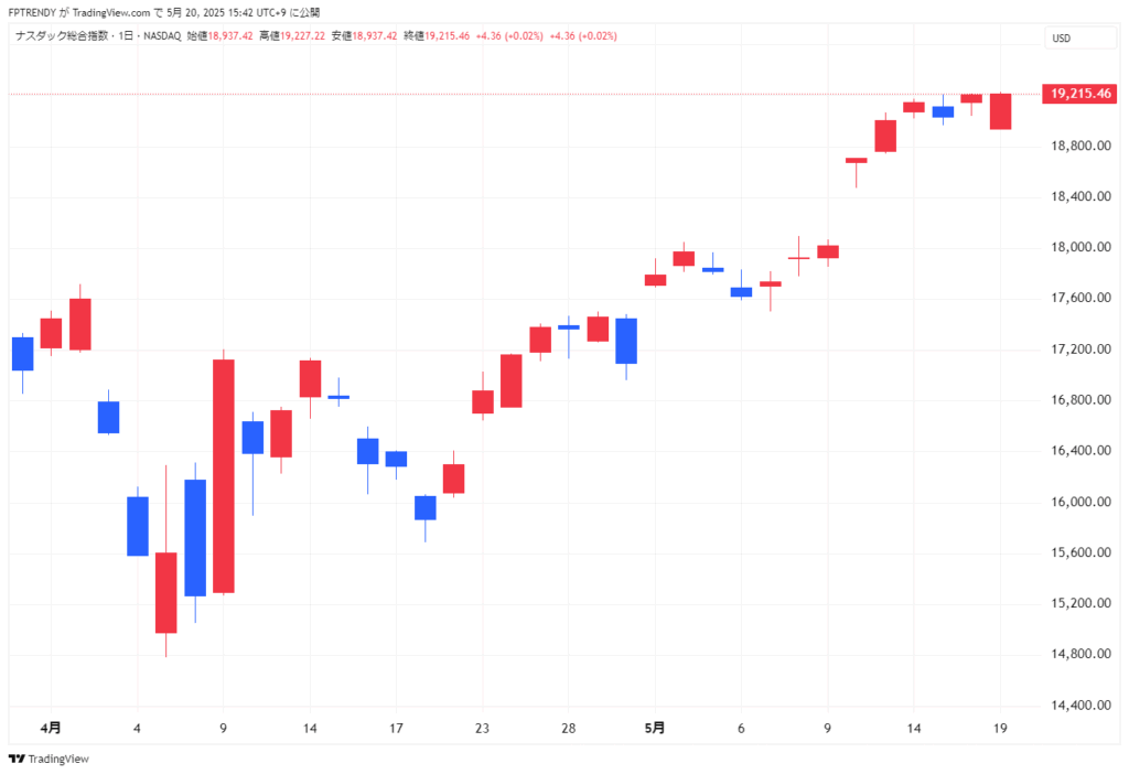 ナスダック総合指数は4.36ポイント(+0.02%)高の19,215.46と、わずかながらも続伸。2月下旬以来の高値水準を維持しました。