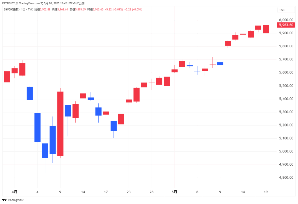S&P500種株価指数は前週末比5.22ポイント(+0.08%)高の5,963.60で終了し、こちらも2月下旬以来の高値を更新。6営業日連続の上昇で、市場全体としては底堅い推移を示しました。
