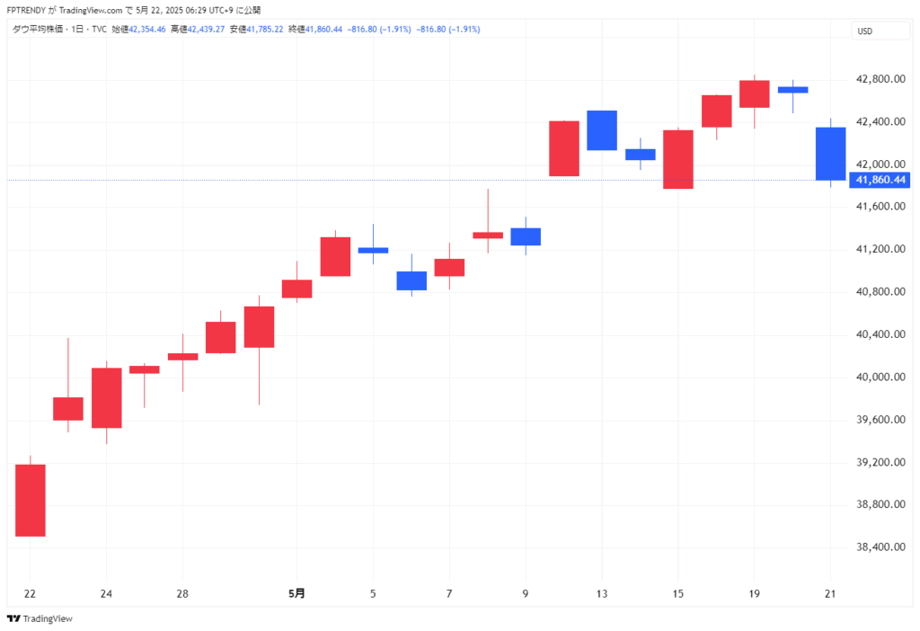 21日のニューヨーク市場でダウ工業株30種平均は前日比816.80ドル(1.91%)安の41,860.44ドルで取引を終え、4日続落となりました。米財務省が実施した20年債入札結果を受けて長期金利が一段と上昇し、一時4.60%と約3カ月ぶりの高水準を付けたことで、株式市場全体に売り圧力が広がりました。金利上昇は株式の割高感を強め、売りが加速した格好です。