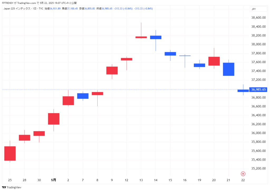 22日の東京株式市場で日経平均株価は続落し、終値は前日比313円11銭(0.84%)安の36,985円87銭を付けました。3万7,000円の大台を下回るのは8営業日ぶりで、取引中には400円を超える下げ幅を記録する場面もありました。半導体関連など主力銘柄への売りが優勢となり、引けにかけて下げ渋る動きは限られませんでした。 47NEWSReuters Japan