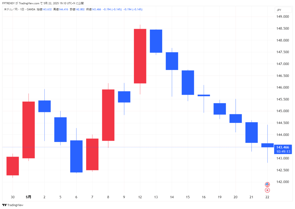 - 円相場:ドル/円は143.4120付近と円高が進み、米財政懸念を背景としたドル売りが継続しました。ドルは前日比0.18%安となり、約2週間ぶりの高水準水準に円が買われました。 トレーディングエコノミクス