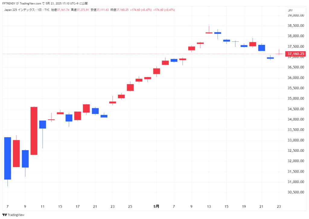 終値は前日比174円60銭高の37,160円47銭。前日の米国市場で発表された5月の米製造業・サービス業PMI速報値の改善や、FRBウォラー理事の利下げ示唆が買い安心感を誘い、一時300円を超える上昇を見せました。一方で、上値抵抗となっている200日移動平均線を突破できず、利益確定の売りに押される場面もありました。