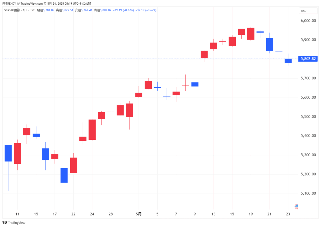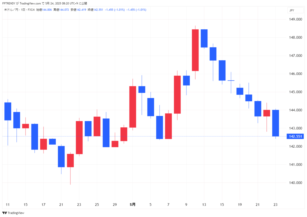 23日の米株式市場は、トランプ米大統領が欧州連合(EU)に対し6月1日から50%の関税を課すと表明したことで、関税を巡る先行き不透明感が再び台頭。ダウ工業株30種平均は4日続落となり、主力株を中心に売りが優勢でした。来週のメモリアルデー連休入りを控え、節目の売りが一巡した後は押し目買いも散見されたものの、市場センチメントはしばらく重い展開が続きそうです。