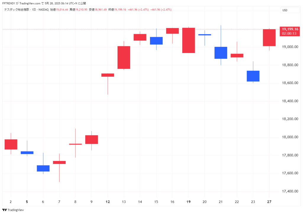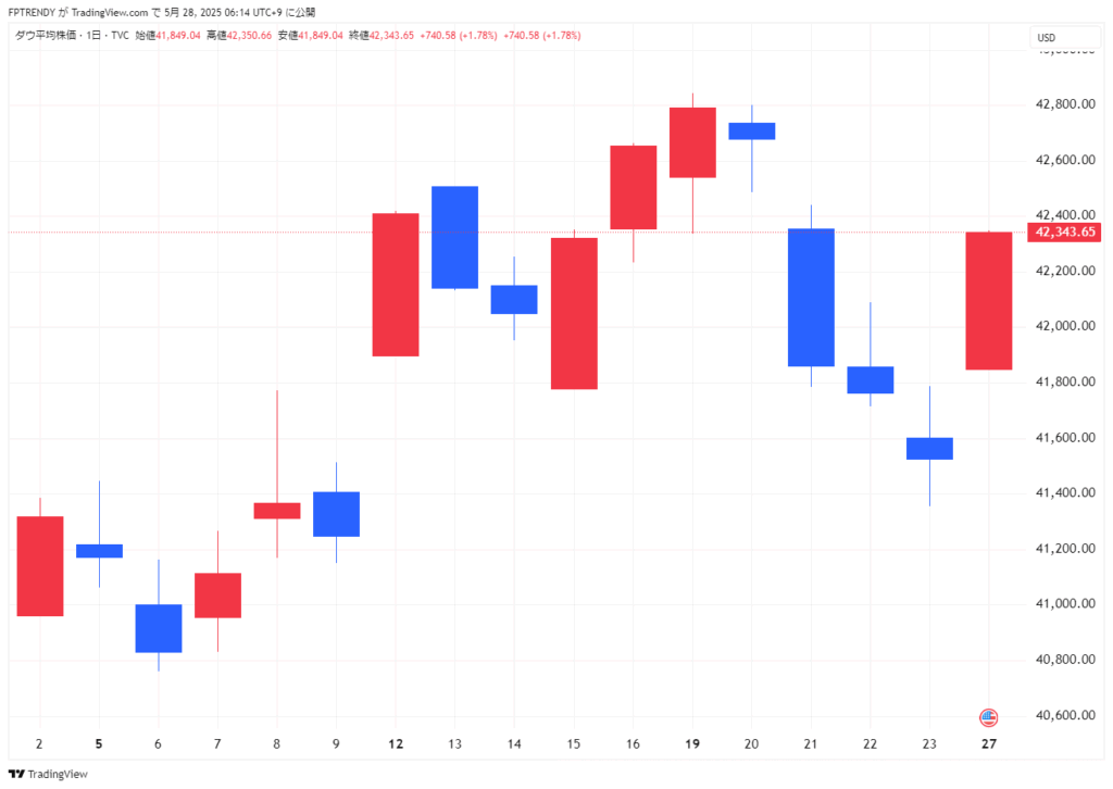 27日の米株式市場では、トランプ米大統領がEU向け追加関税の発動を7月9日まで延期すると表明したことで、過度な貿易摩擦懸念が後退。併せて5月の米消費者信頼感指数が市場予想を上回る改善を示したことが好感され、主要3指数はそろって反発しました。週末の3連休前とあって、売り一巡後の押し目買いが入る動きも見られました。
