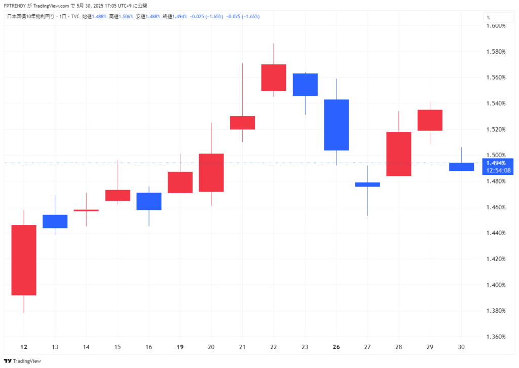 新発10年物国債の利回りは前日比0.020%低下し1.500%で推移。米国の長期金利低下や国内債券市場への買いが強まったことが要因です。財務省の2年債入札も好調で「強め」の結果となり、債券需給の引き締まりが債券市場の安心感につながりました。一方でインフレ進行を受けた日銀の利上げ観測は債券相場の重しとなっています。
