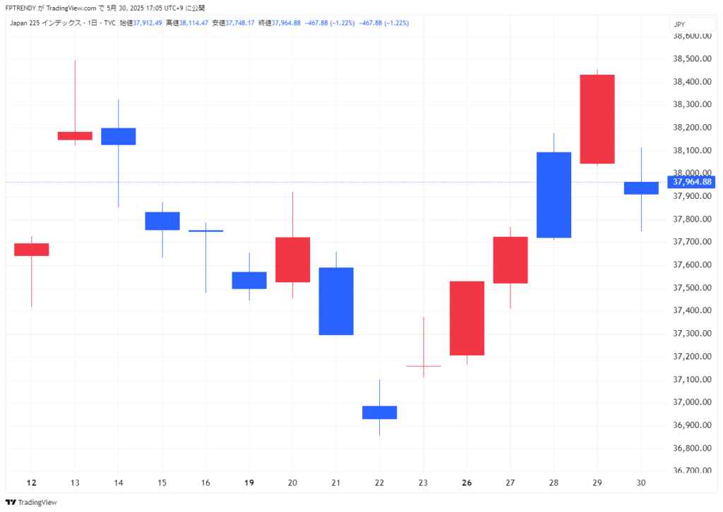 終値は前日比467円88銭(1.22%)安の3万7965円10銭となり、前日に回復した3万8000円台をあっさり割り込みました。トランプ関税を巡る米国際貿易裁判所の判決が一時停止されたことによる不透明感や円高進行が売り圧力となりました。半導体関連株も軒並み値を下げ、アドテストは一時4%超の下落を記録。前日のエヌビディア効果による相場の上昇は続きませんでした。