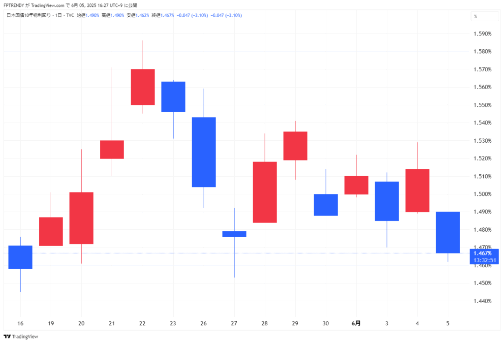 **新発10年物国債利回りは1.467%(前日比-0.047pt)**と低下。米長期金利の下落や、国内で実施された30年債入札の低調な結果を受けて超長期債利回りが急低下したことが影響しました。債券市場では、財務省による超長期債発行減額への期待や流通市場での供給制限も買い材料となり、長期ゾーンの利回り低下が目立っています。