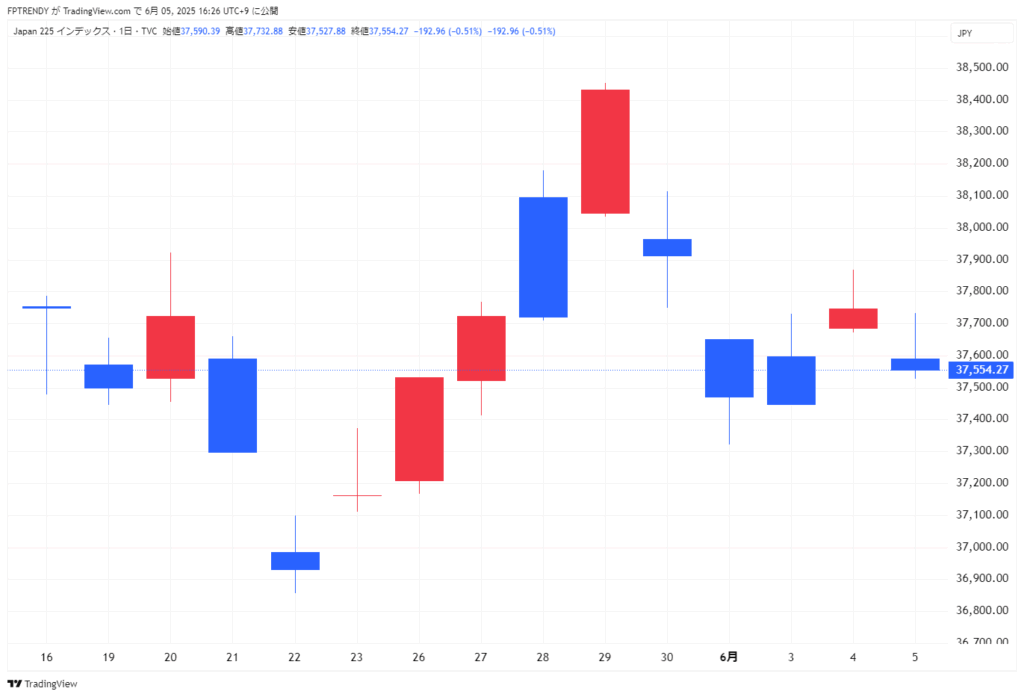 日経平均は前日比192円96銭安の3万7,554円49銭で取引を終え、反落となりました。主な下落要因は、米景気指標の悪化を受けた円高進行による自動車株など輸出関連の売り。午前中には一時200円超下落する場面もありましたが、半導体関連の急伸や先物買い戻しもあり、終盤は下げ渋る展開でした。依然として米国の関税政策や為替動向が日本株全体の重石となっています。