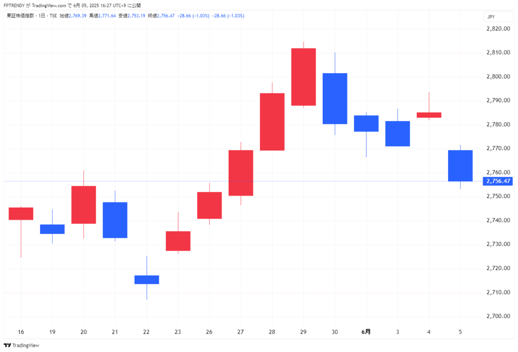 TOPIXも**前日比28.66ポイント安の2,756.47(-1.03%)**と反落。幅広い銘柄で値下がりが優勢となり、特に自動車・海運・通信など外需型セクターが目立って下落しました。一方、内需や一部グロース株への資金シフトもみられましたが、全体ではリスク回避の動きが優勢でした。