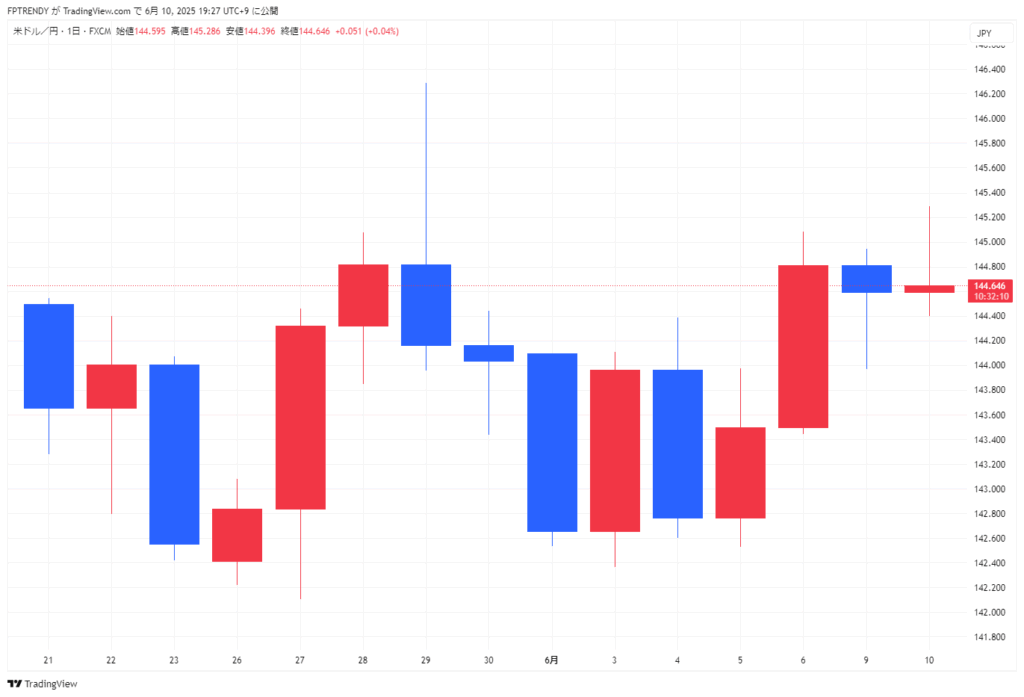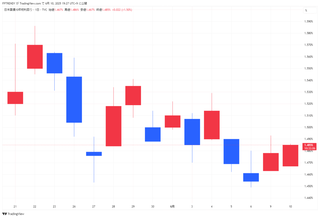 2025年6月10日の東京市場は、日経平均株価が3日連続で上昇し、終値は前日比122円高の3万8211円台となりました。米国のハイテク株の堅調な動きや米長期金利の低下を背景に、半導体関連や中国関連銘柄を中心に買いが広がりました。また、外国為替市場での円安・ドル高も株価を押し上げ、一時は日経平均が400円近く上昇する場面もありました。しかし午後には利益確定売りが強まり、上げ幅は縮小しました。TOPIXも小幅ながら3日続伸し、市場全体の底堅さを示しました。一方で、円相場は米中貿易摩擦の緩和期待を受けて3日連続で下落し、ドル円は144円台半ばで推移しました。債券市場では、自民・公明両党の物価高対策公約による財政悪化懸念から長期金利が上昇し、10年物国債利回りは前日比で0.02%高い1.475%となりました。こうした動きは、国内外の経済政策や国際情勢の影響を受けつつも、個人投資家の積極的な買い意欲に支えられた相場展開となっています。