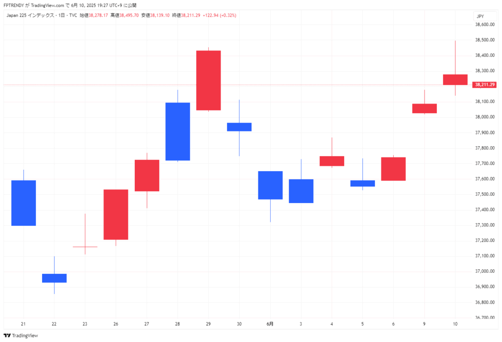 2025年6月10日の東京株式市場で日経平均株価は3日続伸し、終値は前日比122円94銭(0.32%)高の3万8211円51銭となりました。米ハイテク株の上昇や米長期金利低下を背景に買いが優勢で、特に半導体関連株や中国関連銘柄が買われました。外国為替市場での円安・ドル高の動きも日経平均を押し上げ、一時は400円近く上昇しました。ただし午後は利益確定売りが膨らみ上げ幅を縮小し、相場はやや不安定な展開となりました。