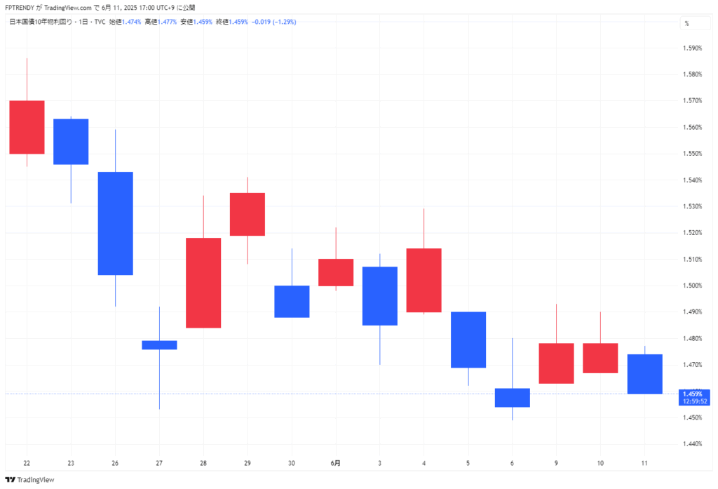 11日の国内債券市場で指標となる新発10年物国債の利回りは前日比0.015%低い1.455%に低下し、債券価格は上昇しました。世界経済の先行き不透明感を背景に安全資産とされる債券に買いが優勢となりました。超長期債の発行減額観測も支援材料となりました。一方で、米中貿易協議の進展がリスク志向を高める要因として債券に対する重荷にもなり、相場の方向感は定まりにくい状況でした。政府・与党による物価高対策の一律給付検討など財政拡張への警戒感も一部影響しています。