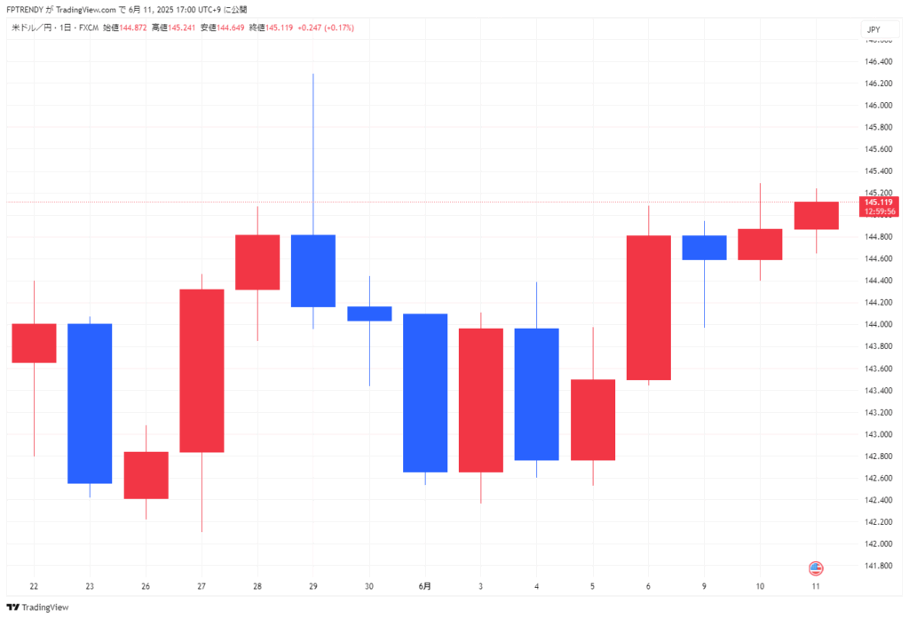 6月11日の東京市場は、米中通商協議の進展期待を背景に株価が4日続伸し、円相場はドル高・円安方向へと動きました。日経平均株価は前日比209円68銭高の3万8421円19銭と堅調な推移を見せ、半導体関連株を中心に買いが広がりました。一方で日本国債の10年物利回りは世界経済の不透明感から低下し、安全資産への買いが優勢となりました。為替市場では1ドル=145円台半ばまで円安が進み、投資家のリスク選好姿勢が強まる一方、利益確定売りや様子見ムードも根強く残るなど、市場は節目を意識しつつも慎重な展開となりました。