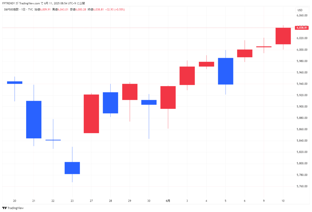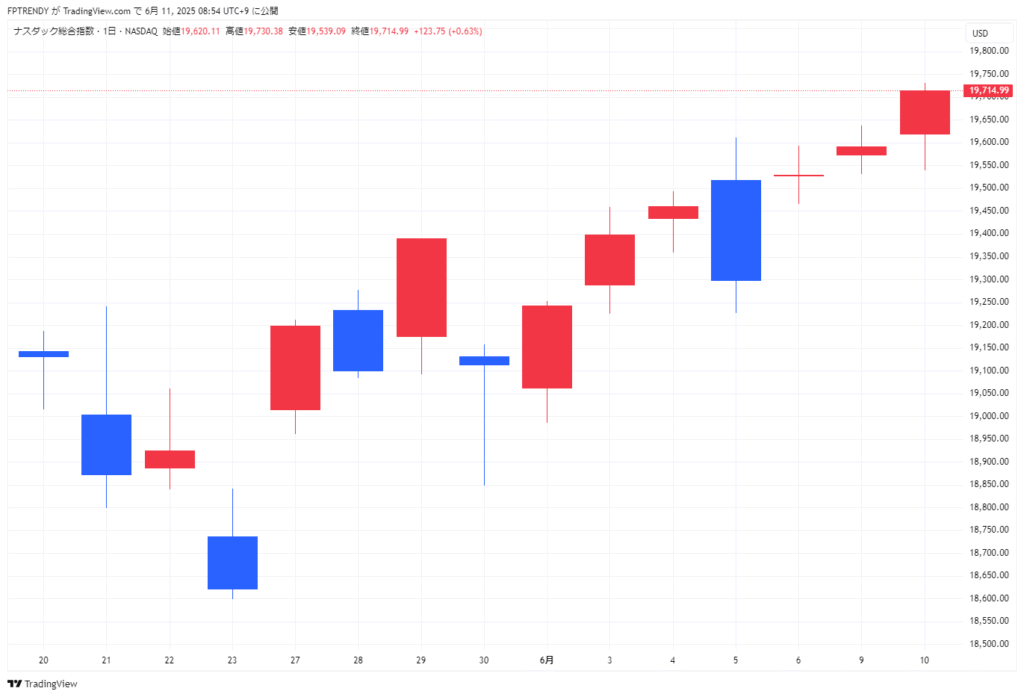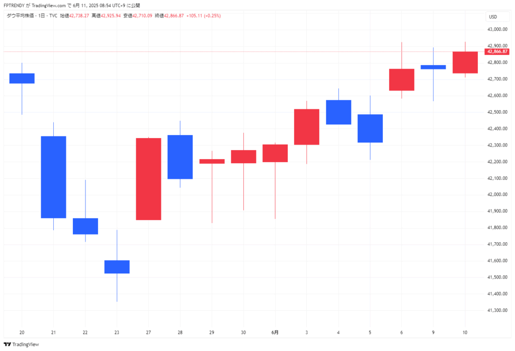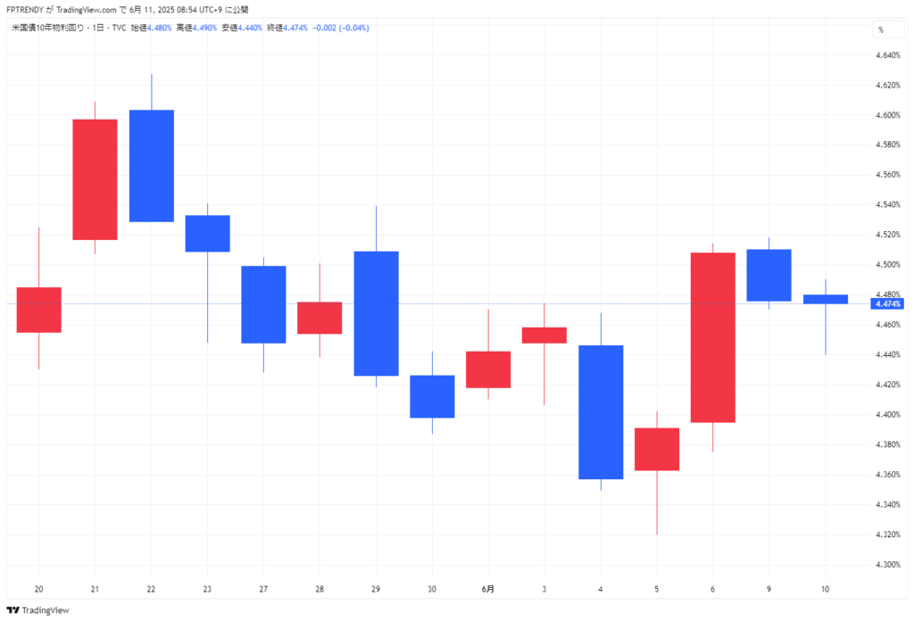 2025年6月10日米国市場動向(ダウ平均株価、S&P500、ナスダック総合指数、米国国債10年物利回りなど)