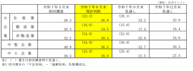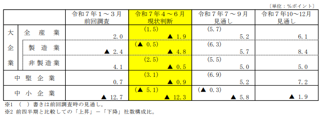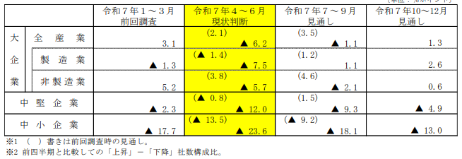 しかし、見通しでは大企業と中堅企業は7~9月期に「上昇超」へ転じる見込みです。一方で中小企業は7~9月期も引き続き「下降超」が続く予想となっています。