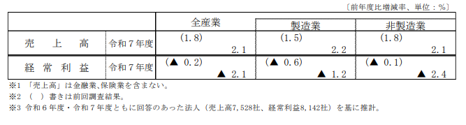 令和7年度の売上高は全体で約2.1%増加が見込まれています。製造業、非製造業ともに増収予想です。