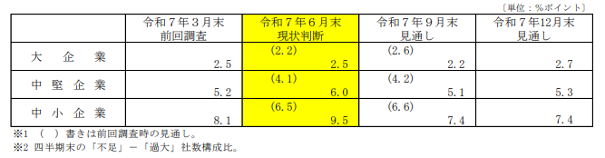 雇用面では、令和7年6月末時点で大企業の「従業員数判断」BSIは26.9ポイントと「不足気味」が56期連続で続いています。中堅・中小企業も同様に人手不足感が強く、今後もこの傾向は続く見込みです。