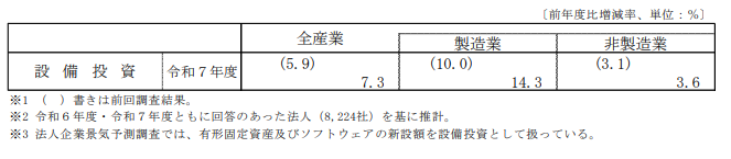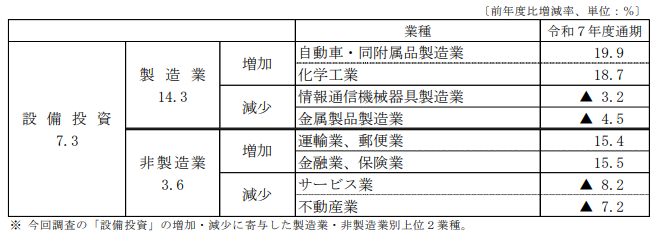 設備投資額は令和7年度に前年比約7.3%増加する見込みで、製造業、非製造業ともに増加が期待されています。特に自動車製造業や化学工業、金融業、郵便運輸業などで設備投資が活発化するとみられています。