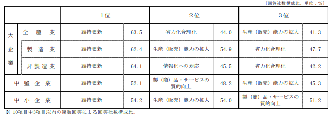 設備投資における目的としては、大企業・中堅企業・中小企業すべてで「維持更新」が最重要とされ、その次に「省力化合理化」、「生産(販売)能力の拡大」が続きます。品質向上や情報化対応も重要視されています。